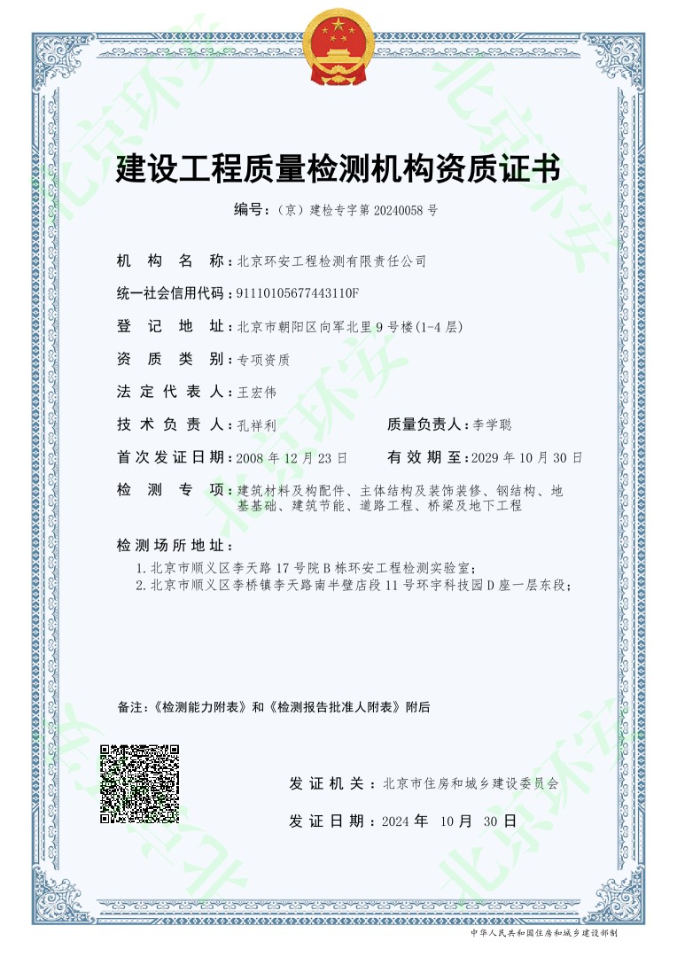 在北京城建集團和北京城建設計發(fā)展集團兩級領導的大力支持下,北京環(huán)安工程檢測有限責任公司(以下簡稱“環(huán)安公司”)于2024年10月30日獲批新的建設工程質量檢測機構資質證書,由原有3個檢測專項擴增至7個檢測專項,包括:主體結構及裝飾裝修、鋼結構、地基基礎、建筑材料及構配件、建筑節(jié)能、道路工程和橋梁及地下工程,其中,后四項為新增檢測專項。經(jīng)過近兩年的努力,現(xiàn)已滿足申請檢測綜合資質的基本要求。環(huán)安公司將再接再厲,爭取成為北京市第一批擁有檢測綜合資質的檢測機構。